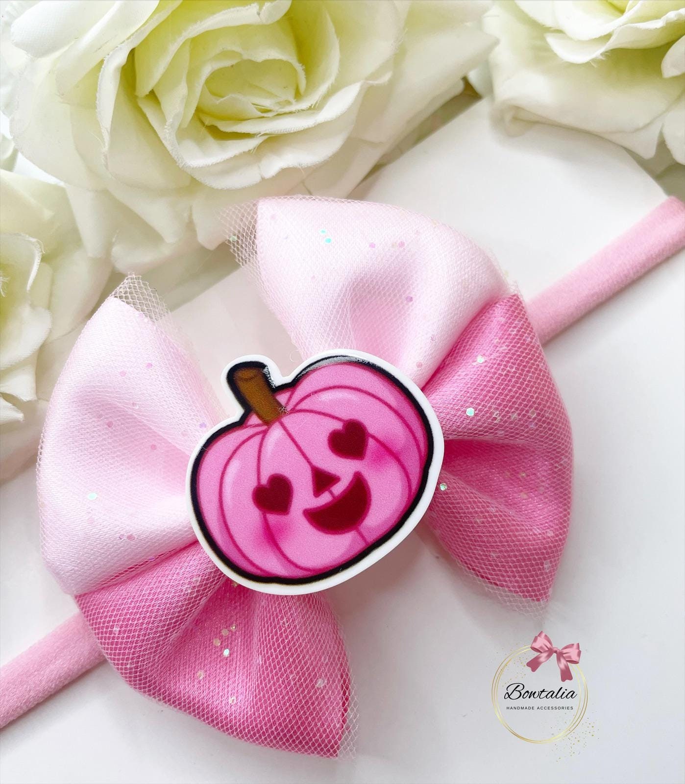 Pink glitter bow with a pink pumpkin centre.