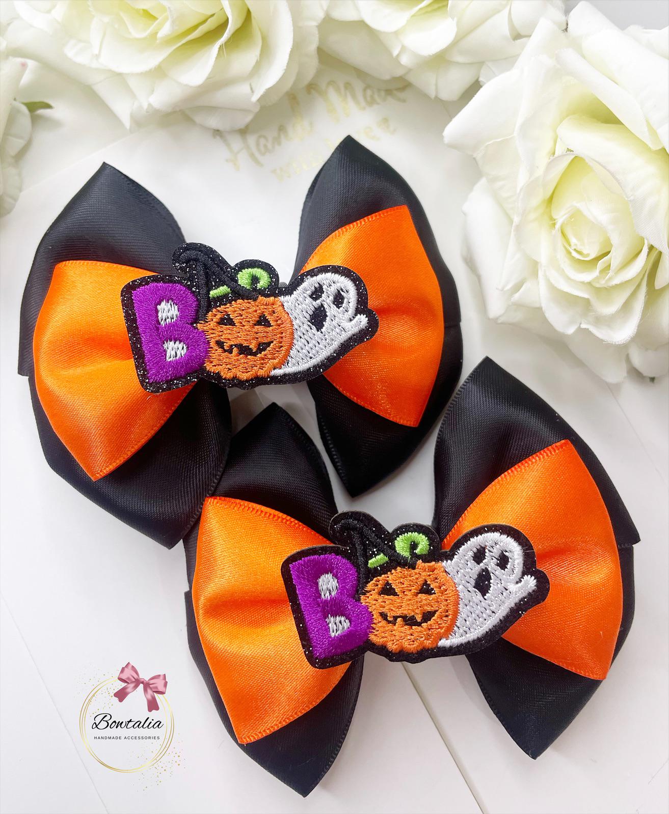 Black and orange bow clips with a halloween centre. Perfect to match with a halloween outfit.