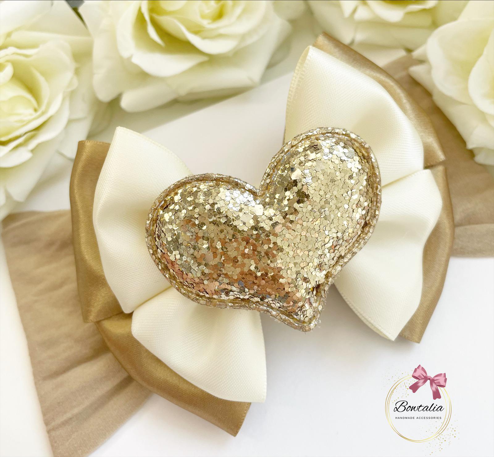 Beautiful layered bow with a sequin heart centre attached to a thick headband. So pretty to accessorise an outfit.
