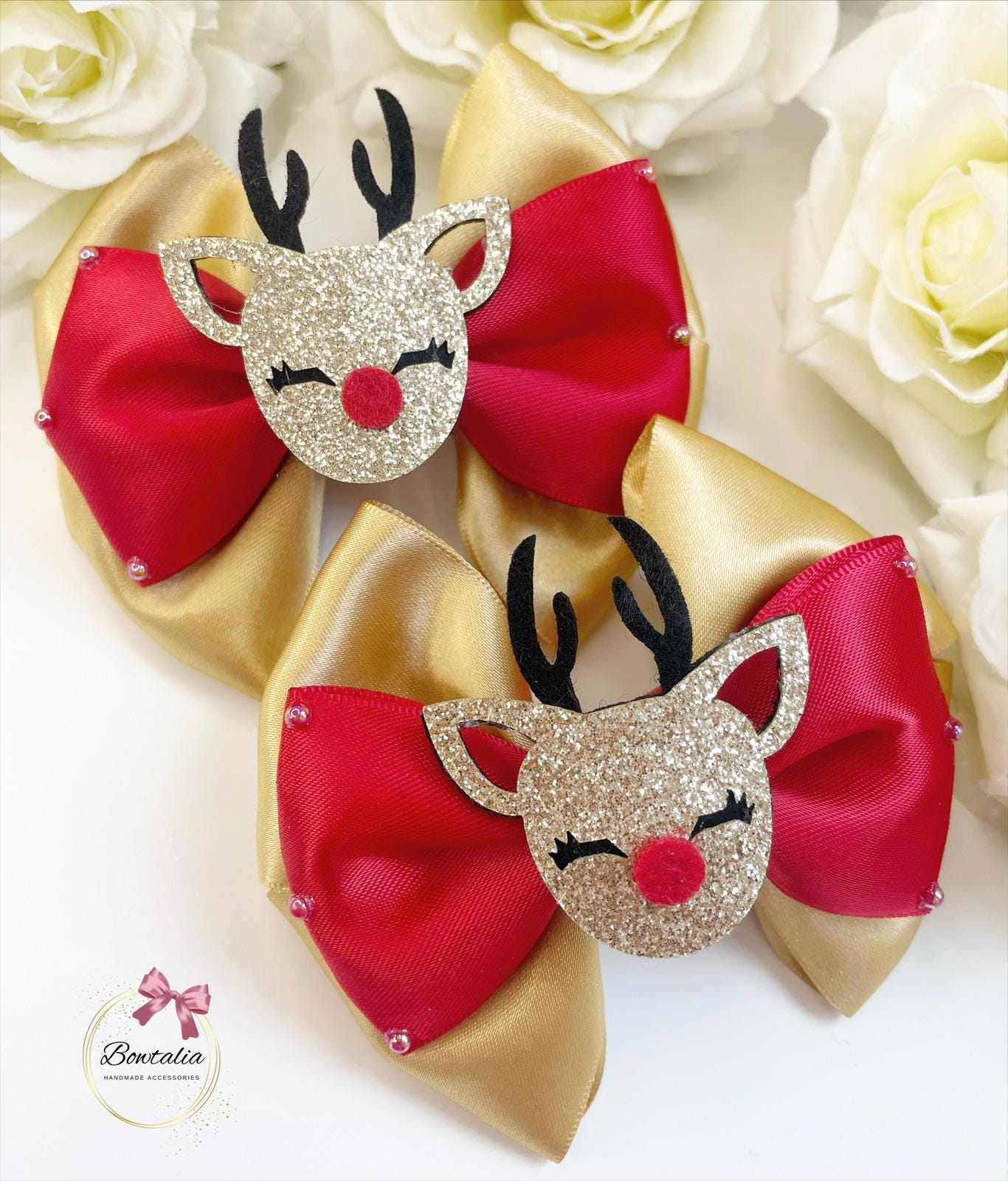 Gold and red Christmas bows with a reindeer centre and pearl details. Perfect to match with a Christmas outfit.