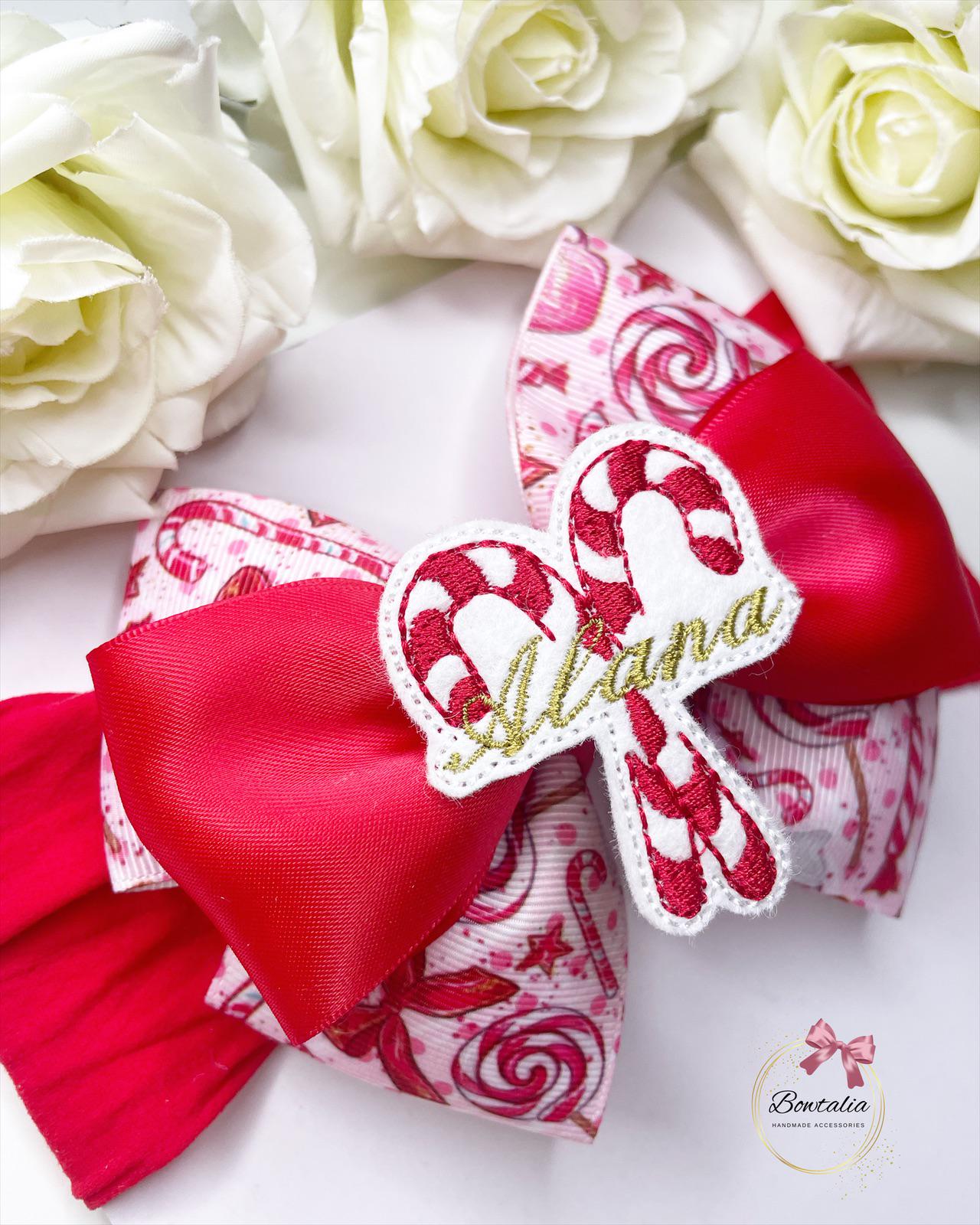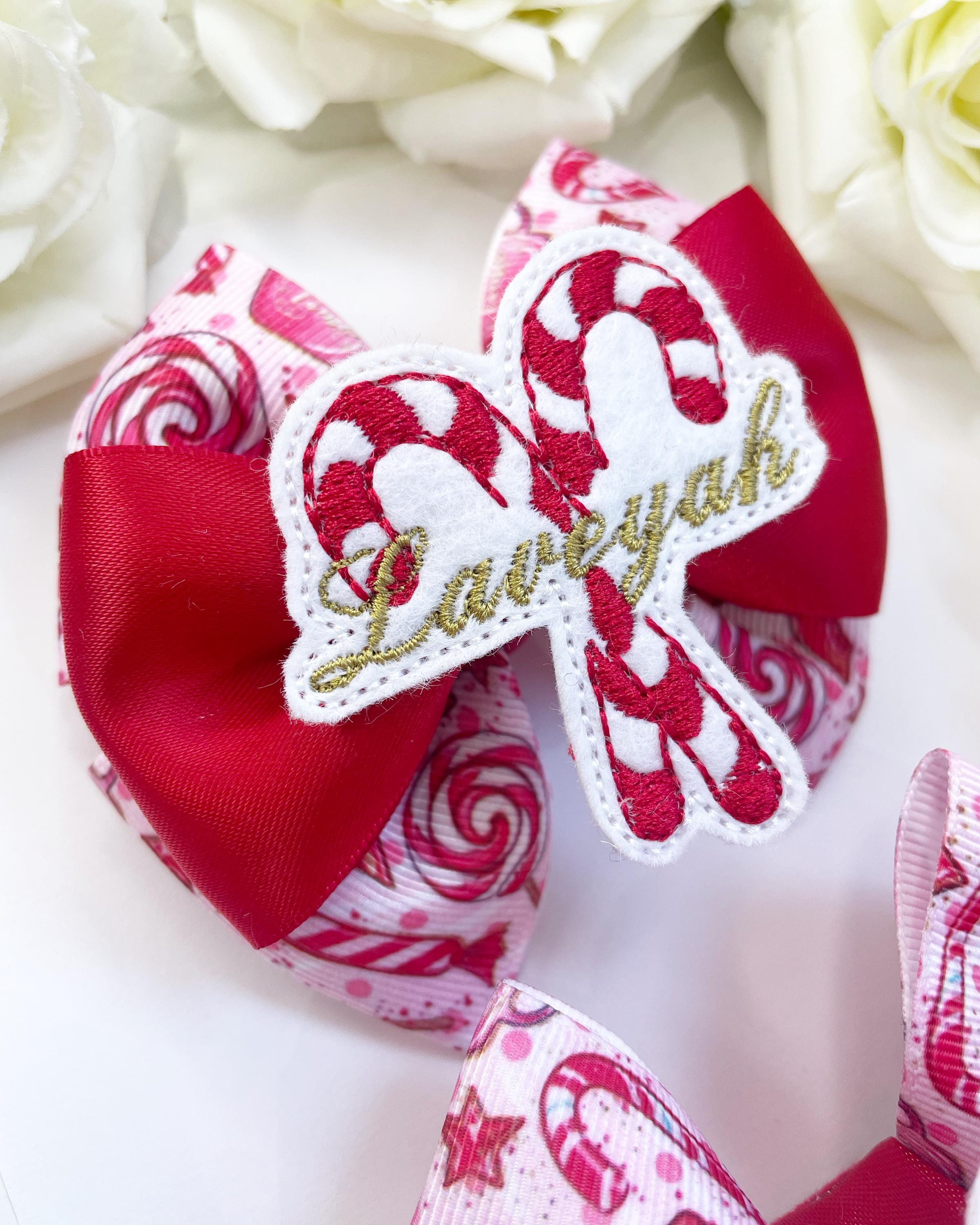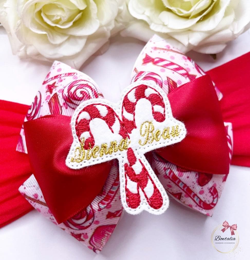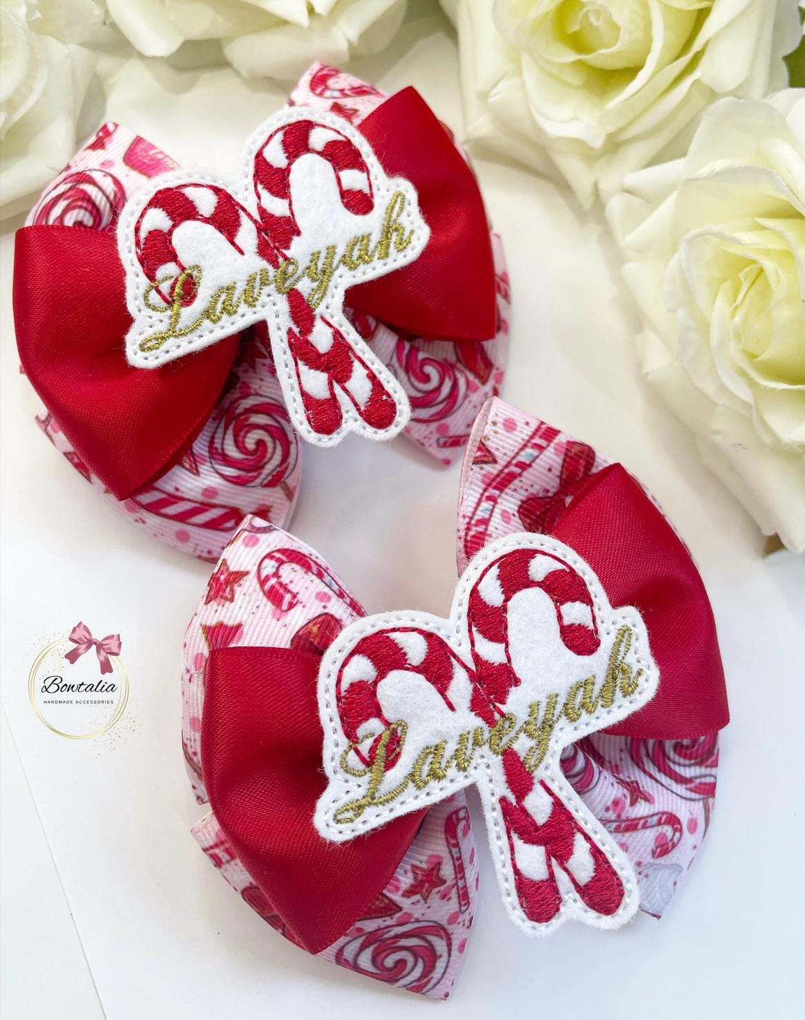 Candycane hair bows with a personalised candycane centre. Perfect to math with a Christmas outfit.