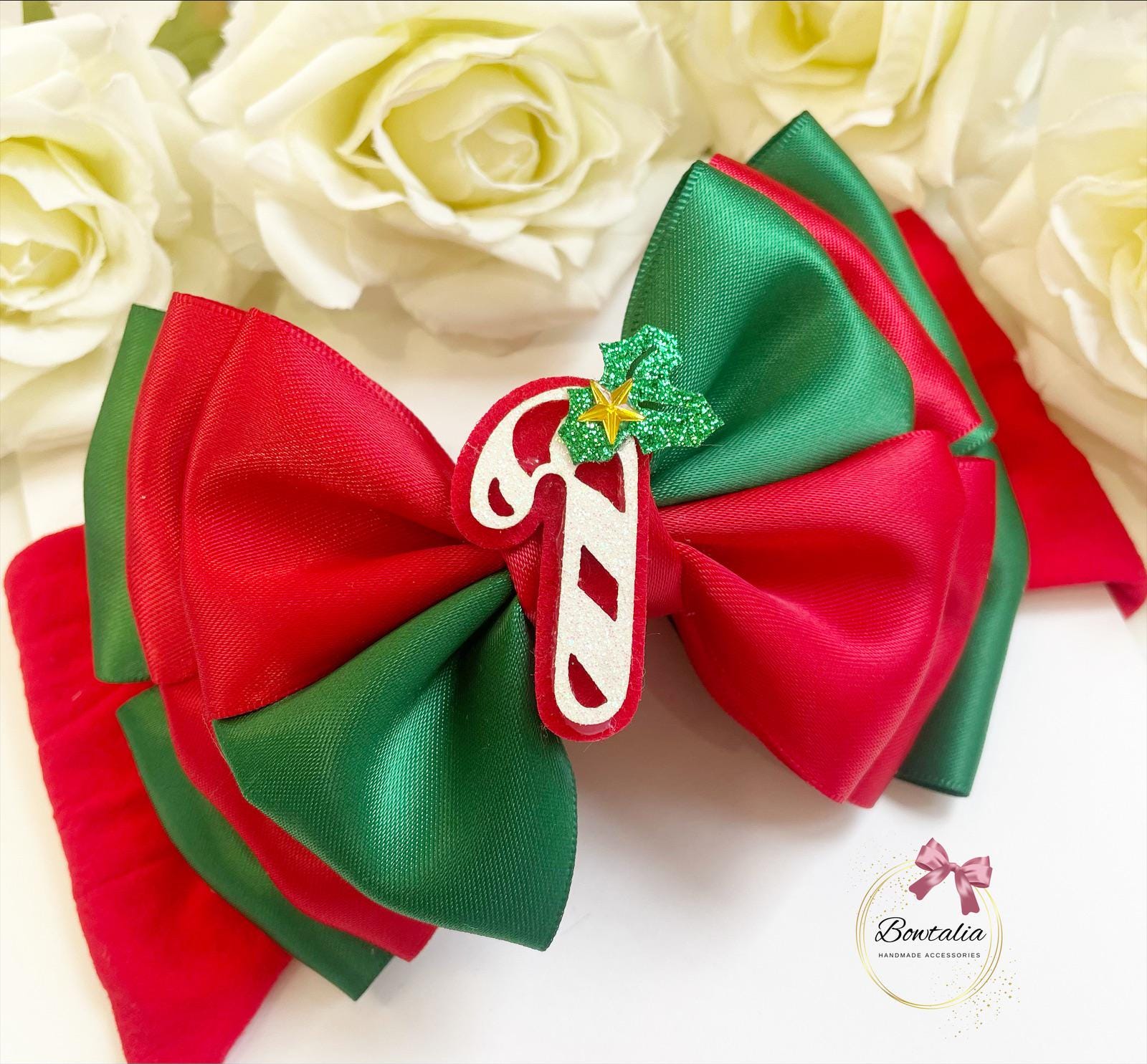 A traditional red and green layered bow with a candy cane centre. Perfect to match Christmas outfits.