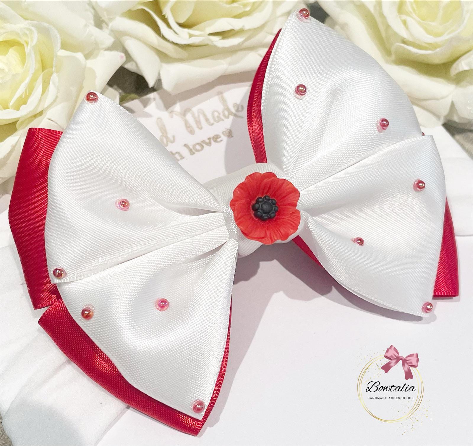 Red and white layered bow with a poppy centre and pearl details - perfect to celebrate Remembrance Day.
