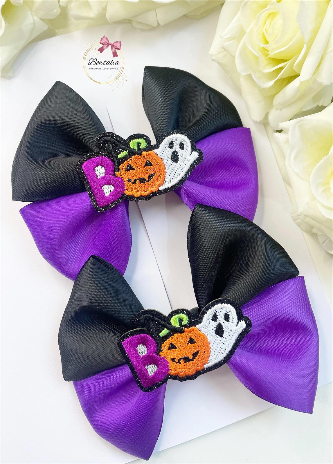 Black and purple bow clips with a halloween centre. Perfect to match with a halloween outfit.