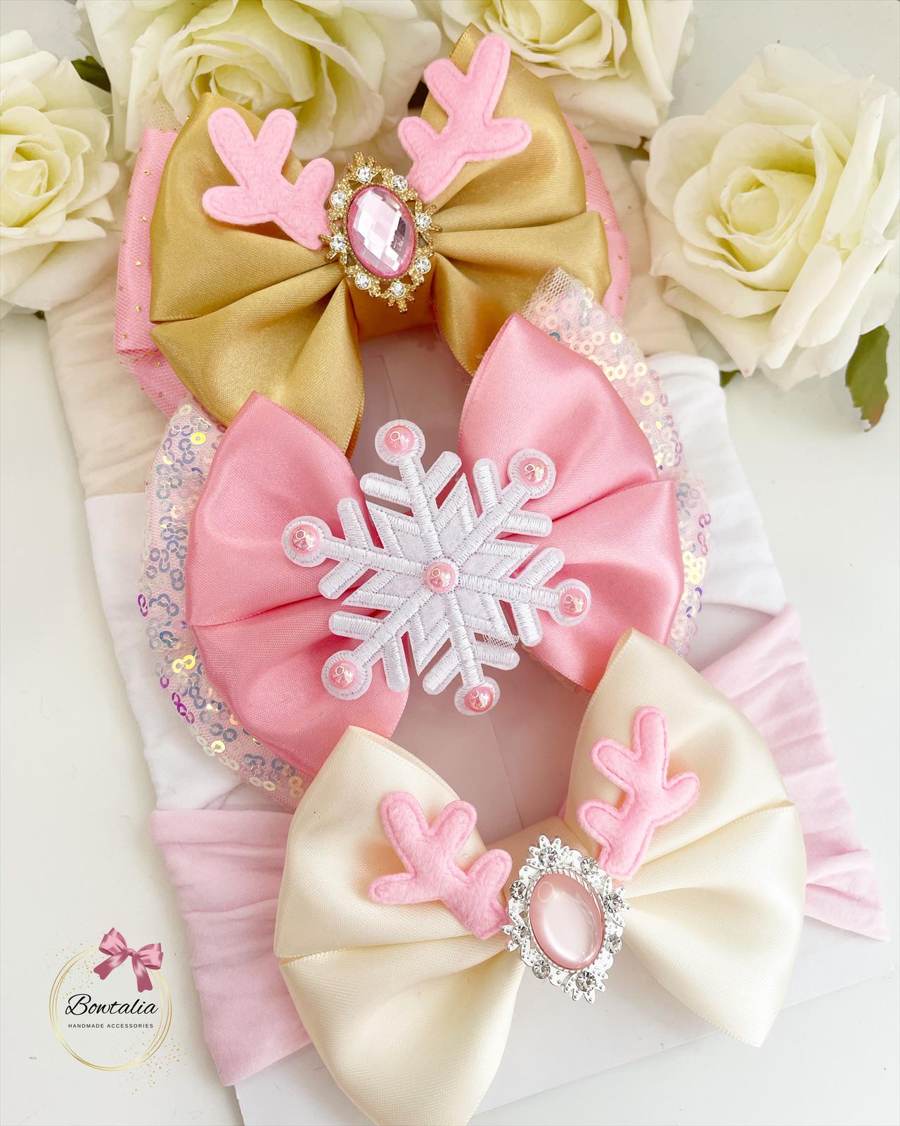 Christmas bows attached to thick nylon headbands. Perfect to match Christmas outfits.