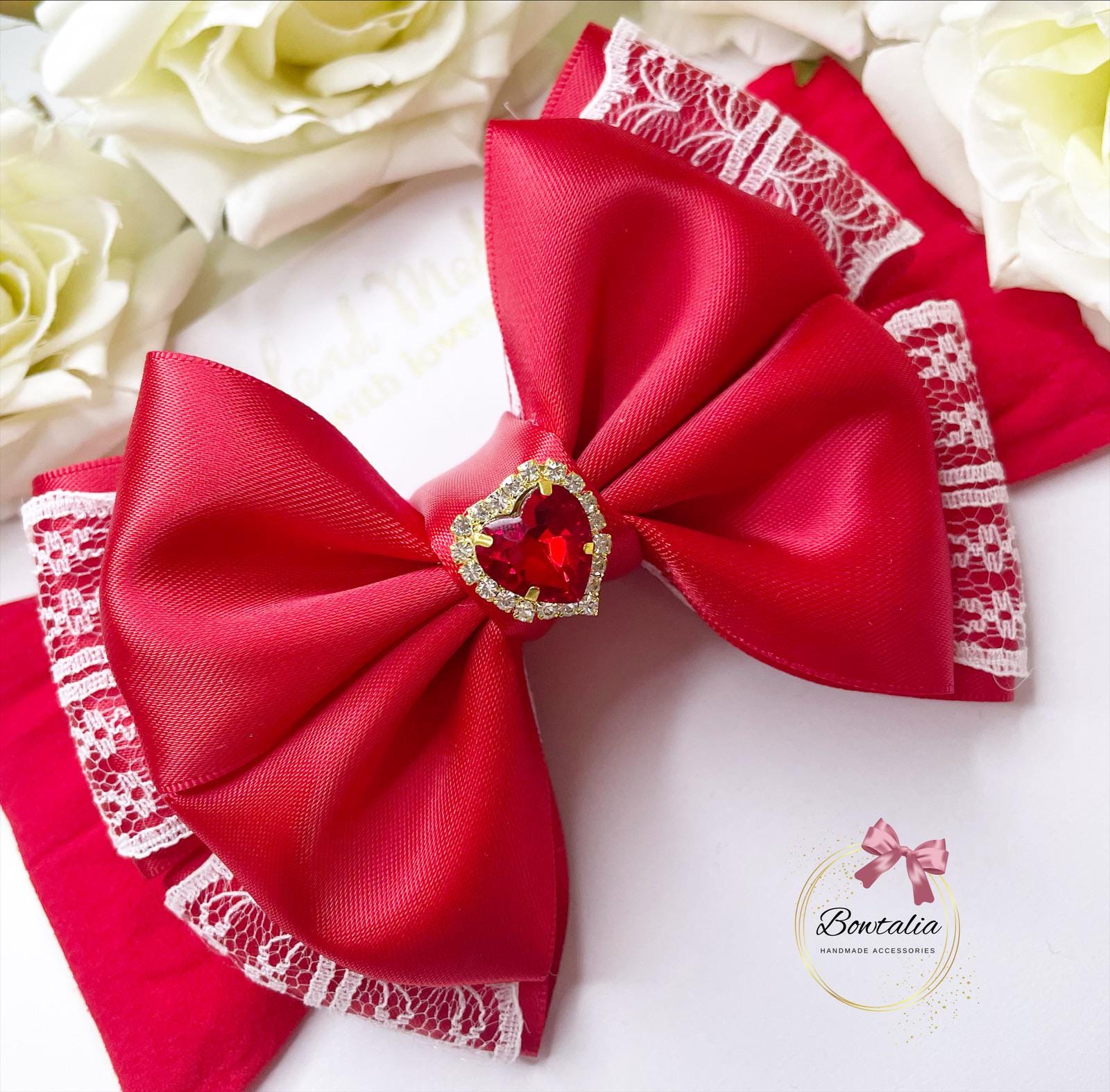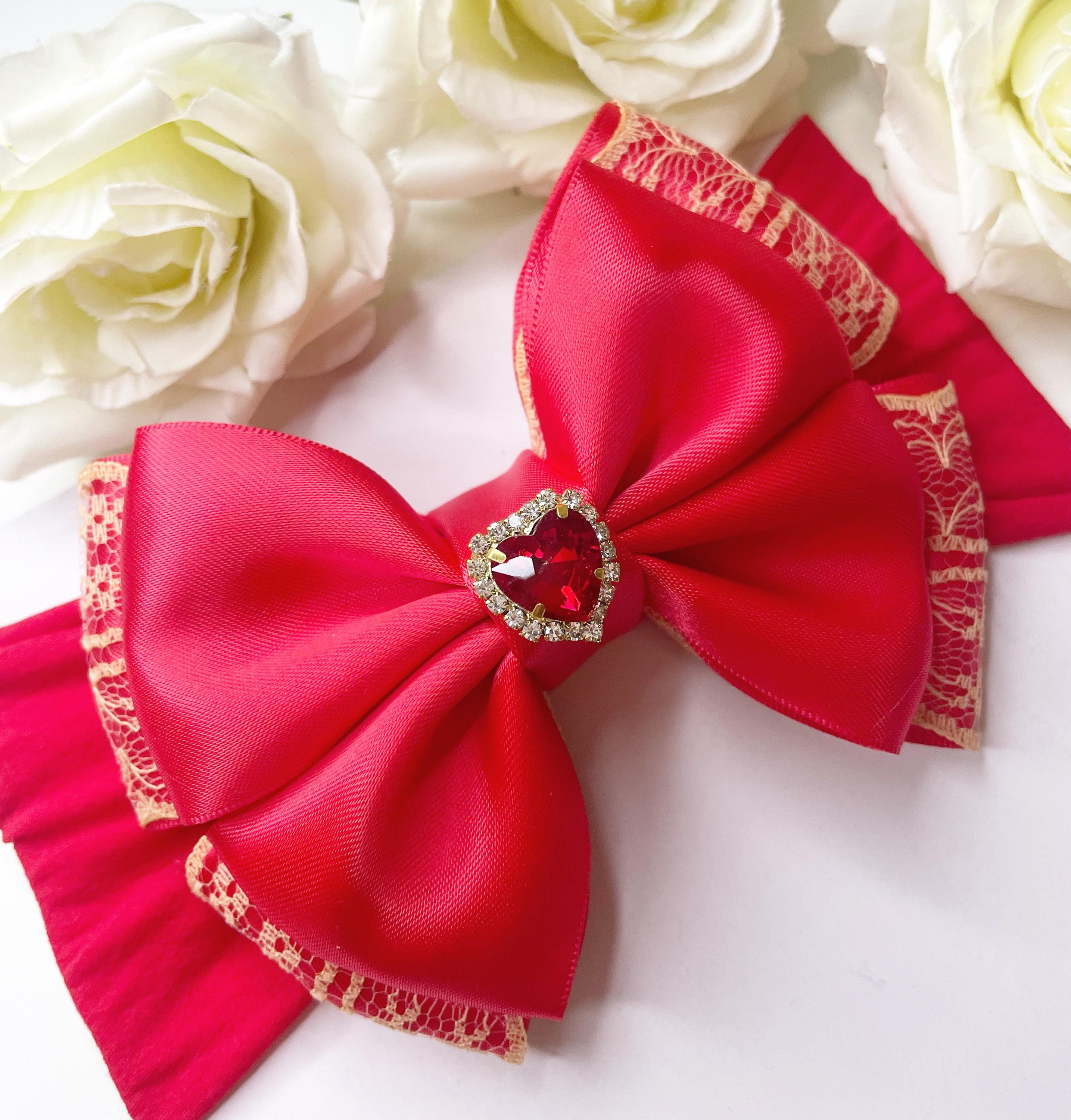 Beautiful layered lace bow with a heart centre. Perfect to match Christmas outfits.