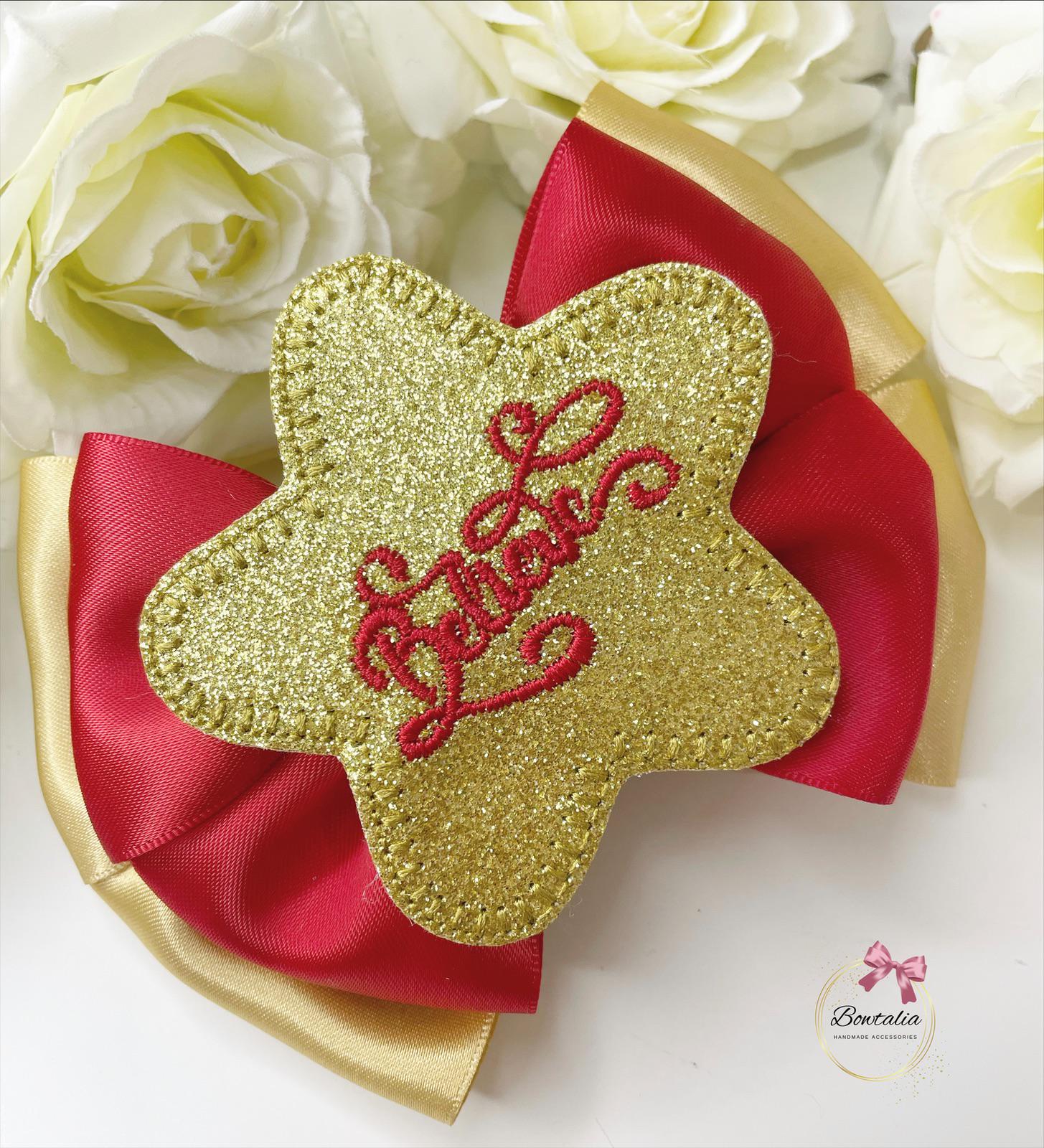 Gold and red bow with a large star centre. Perfect to math with a Christmas outfit.