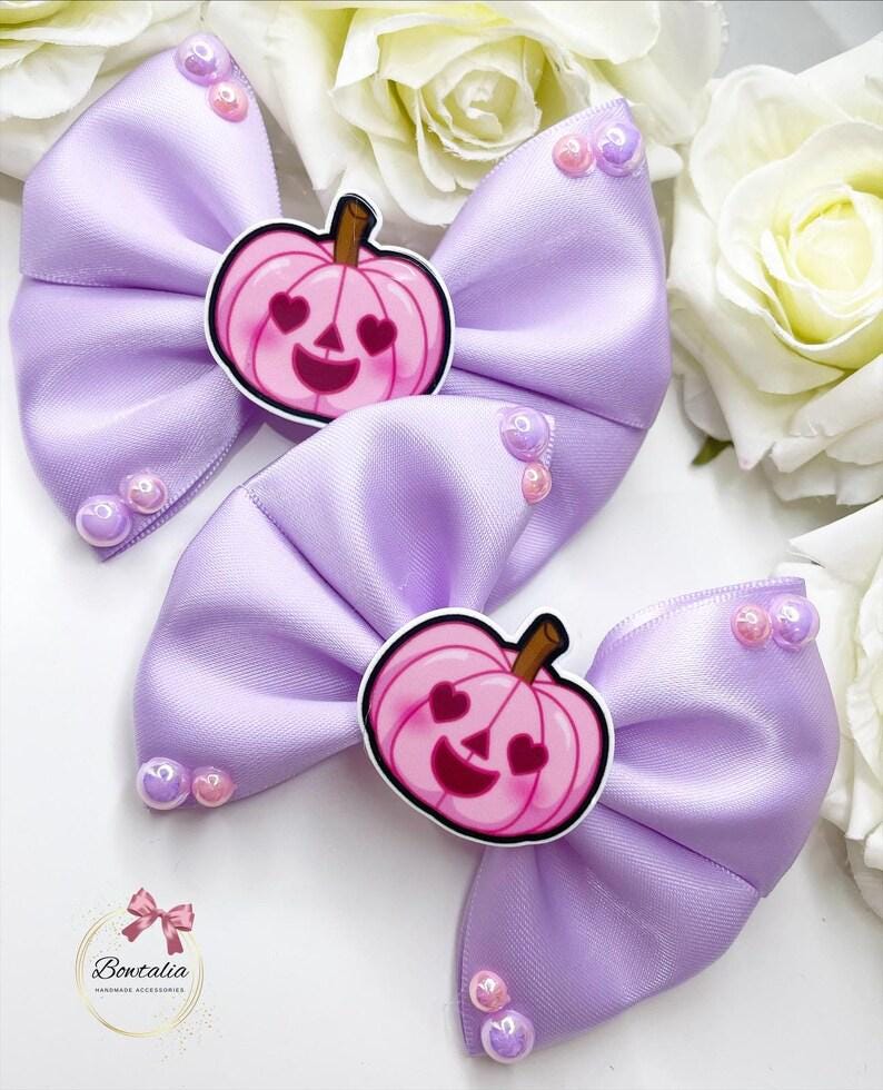 Lilac bows with a pink pumpkin centre and pearl details - each bow is attached to a crocodile clip . Perfect to match with a halloween outfit.