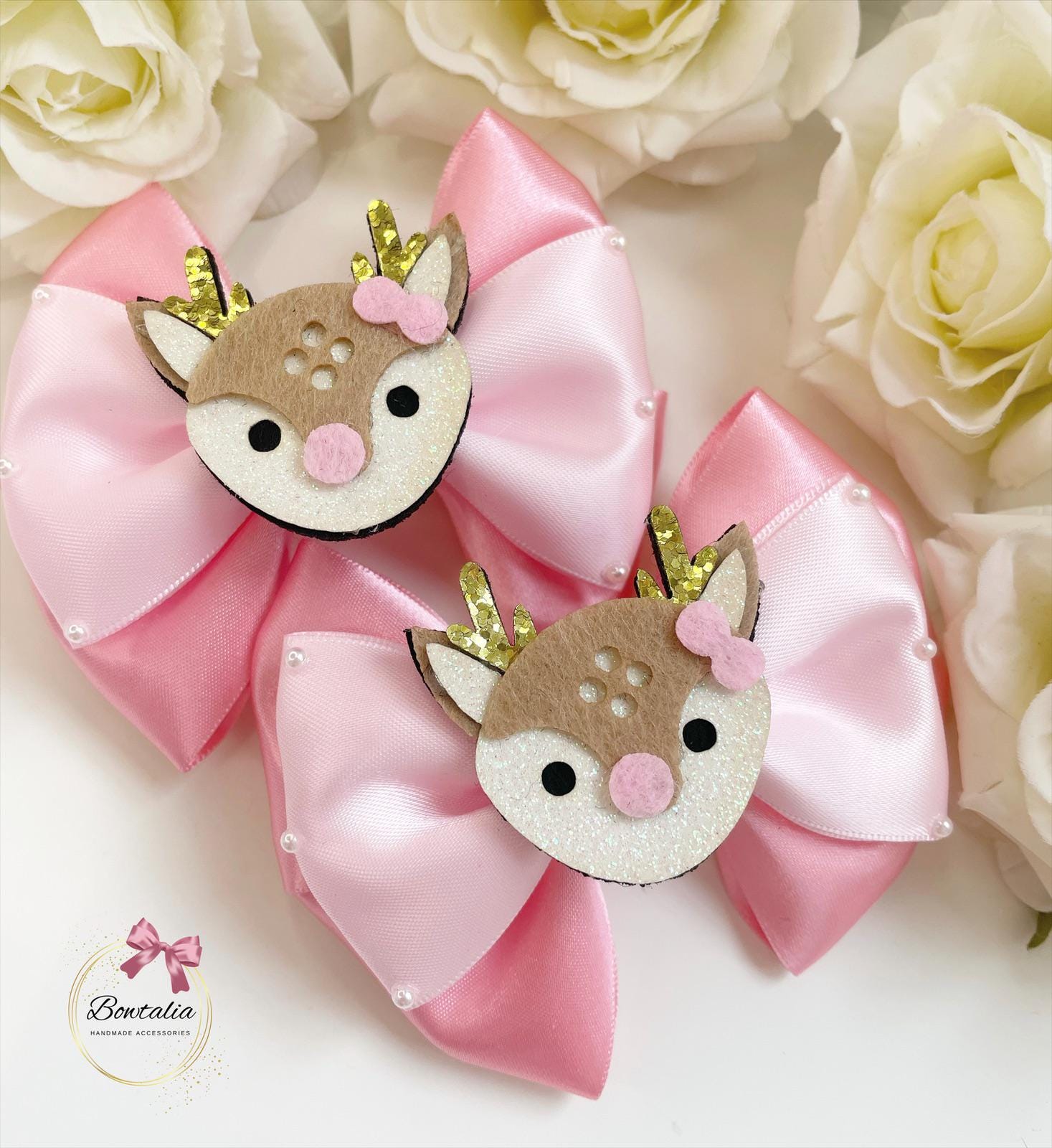Pink Christmas bows with a reindeer centre and pearl details. Perfect to match with a Christmas outfit.