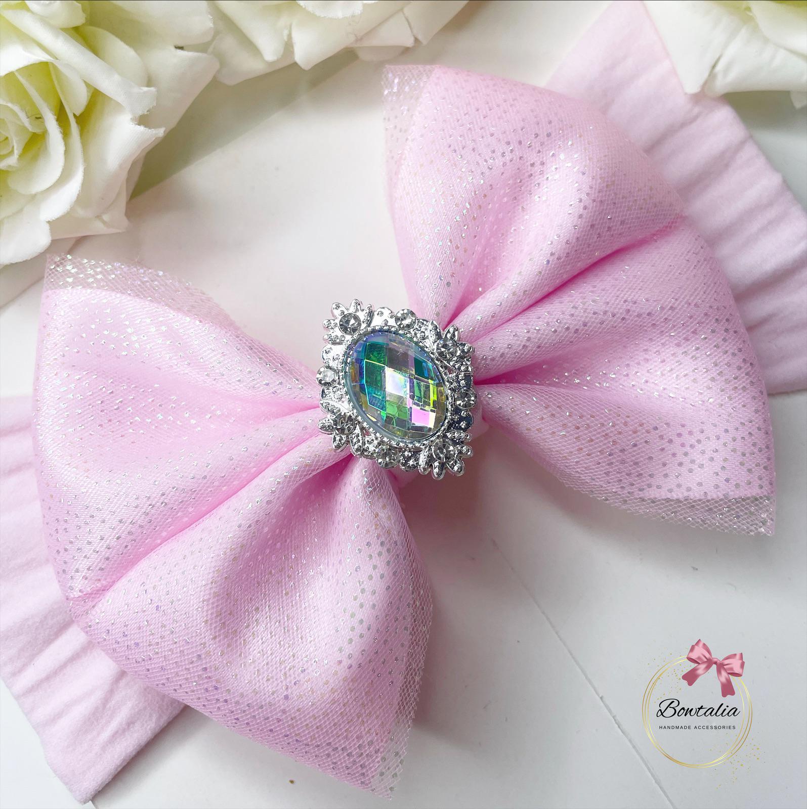 Pink sparkle bow with a hologram embellishment. Pretty to accessorise an outfit.