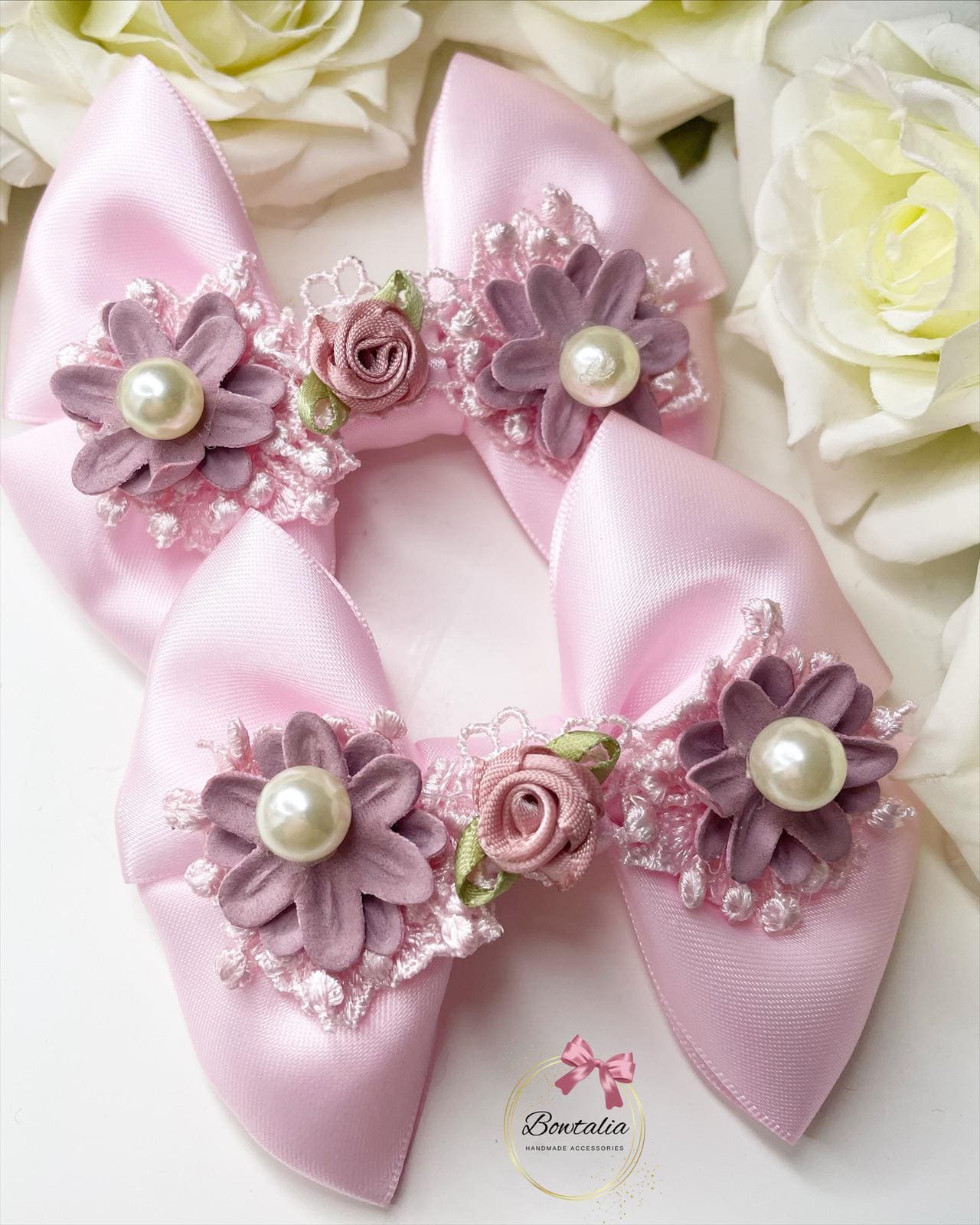Matching pigtail bow clips with a a flower embroider details. This listing is for 2 matching pig tail clips - the bows are attached to a crocodile clip.