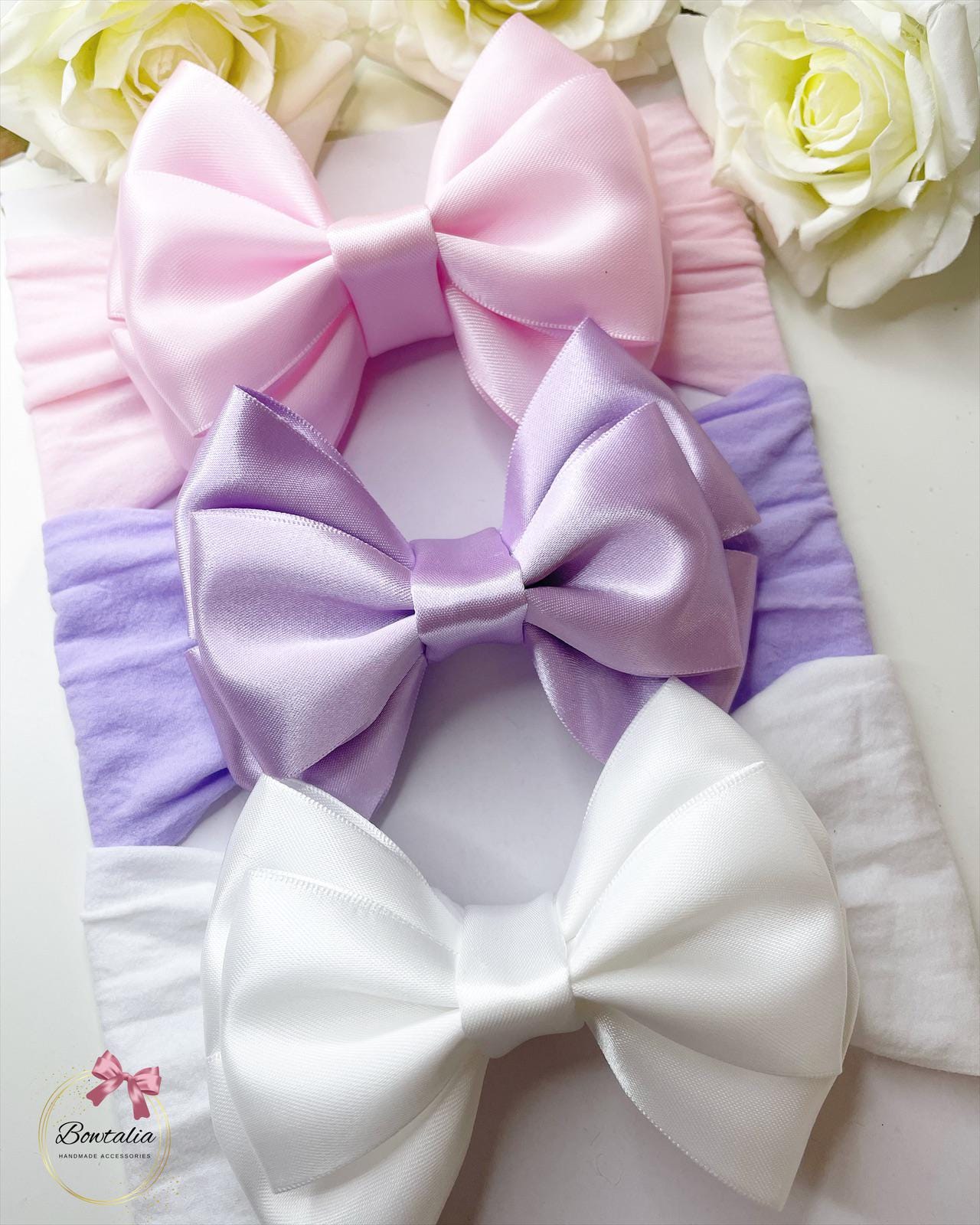 Our 'classic' bows attached to a thick nylon headband. The bow colour is matched with the headband colour - as shown in the example photo.