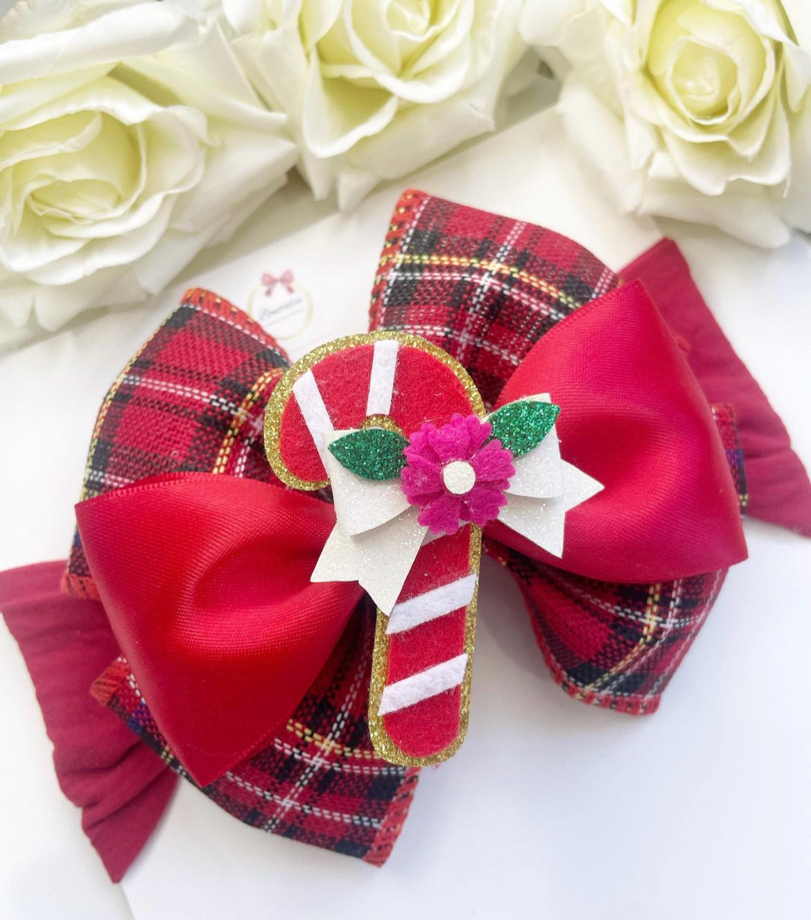 Taryan bow with a red embellishment on a thick burgundy headband.