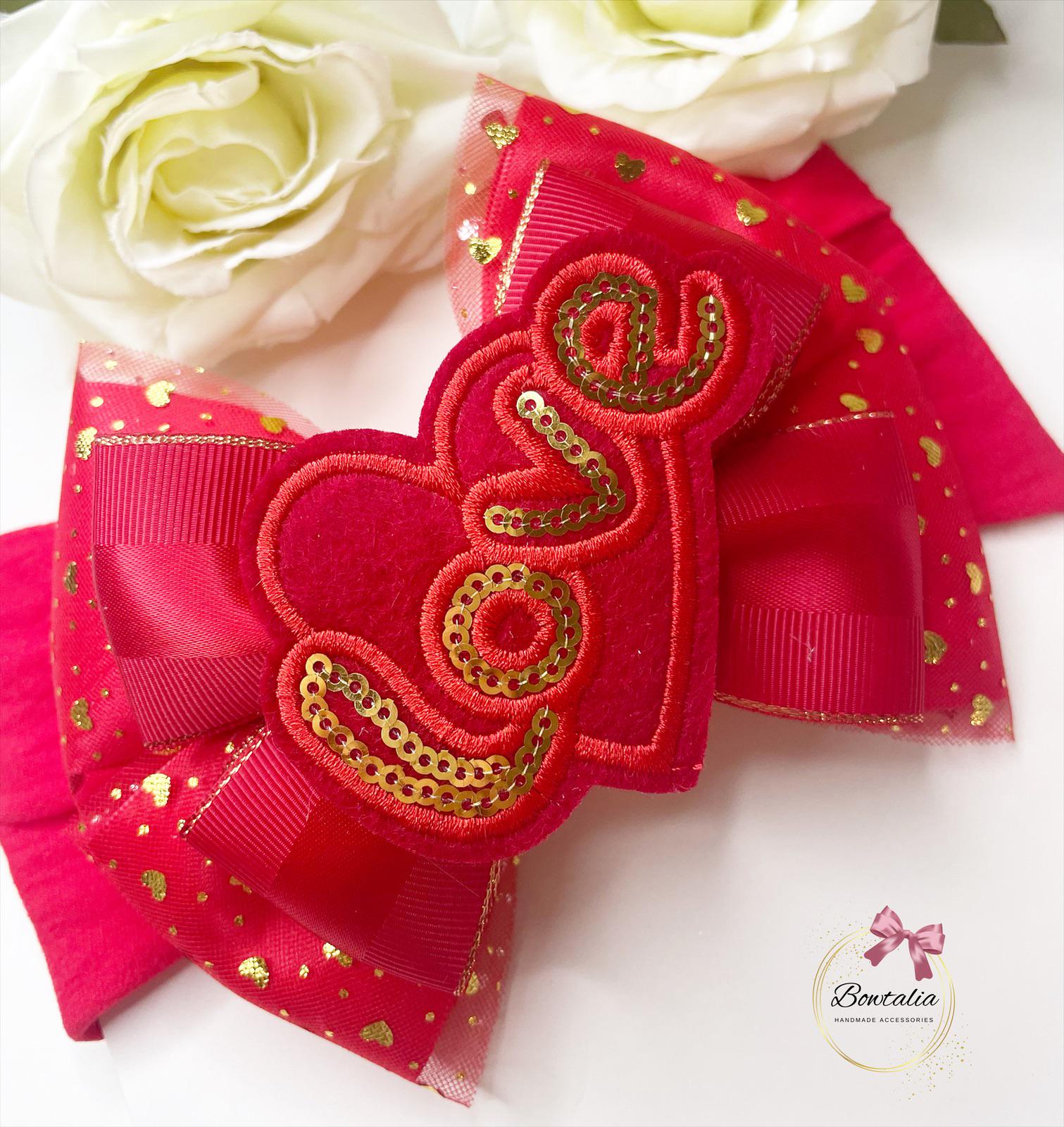 Red layered bow with a 'love' patch centre. Perfect for Valentines Day.