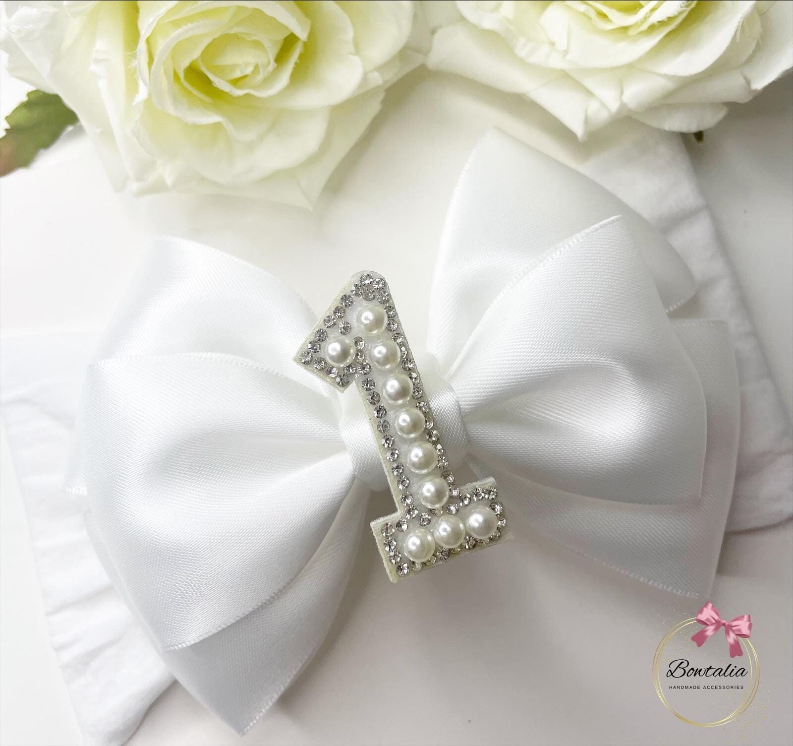 White layered bow with a pearl number/letter centre - attached to a thick headband