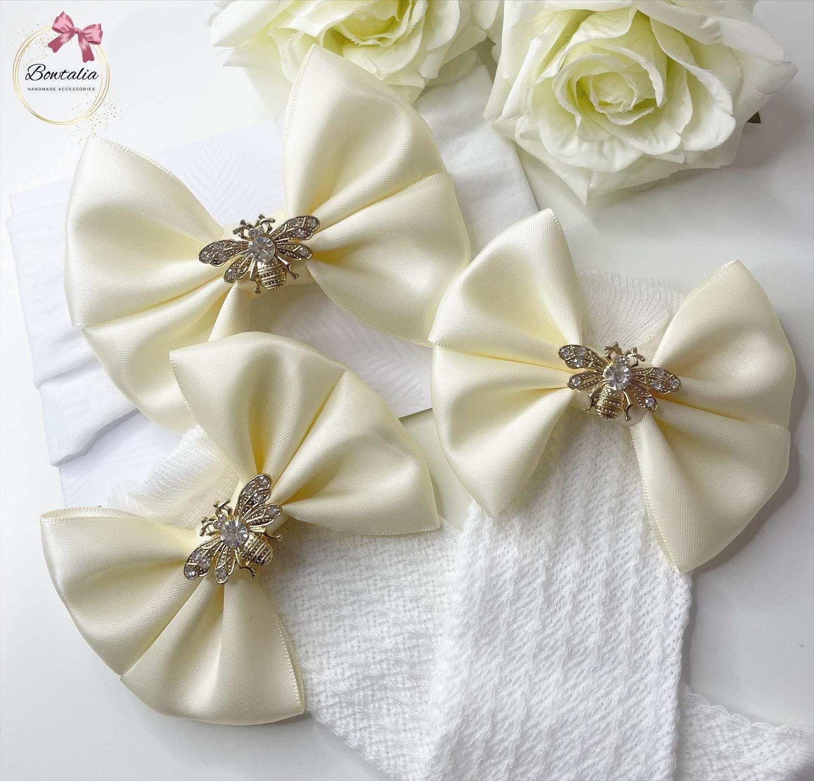 Beautiful matching baby girl set - includes 1 headband and 1 pair of white knee high socks with gold bee embellishments.