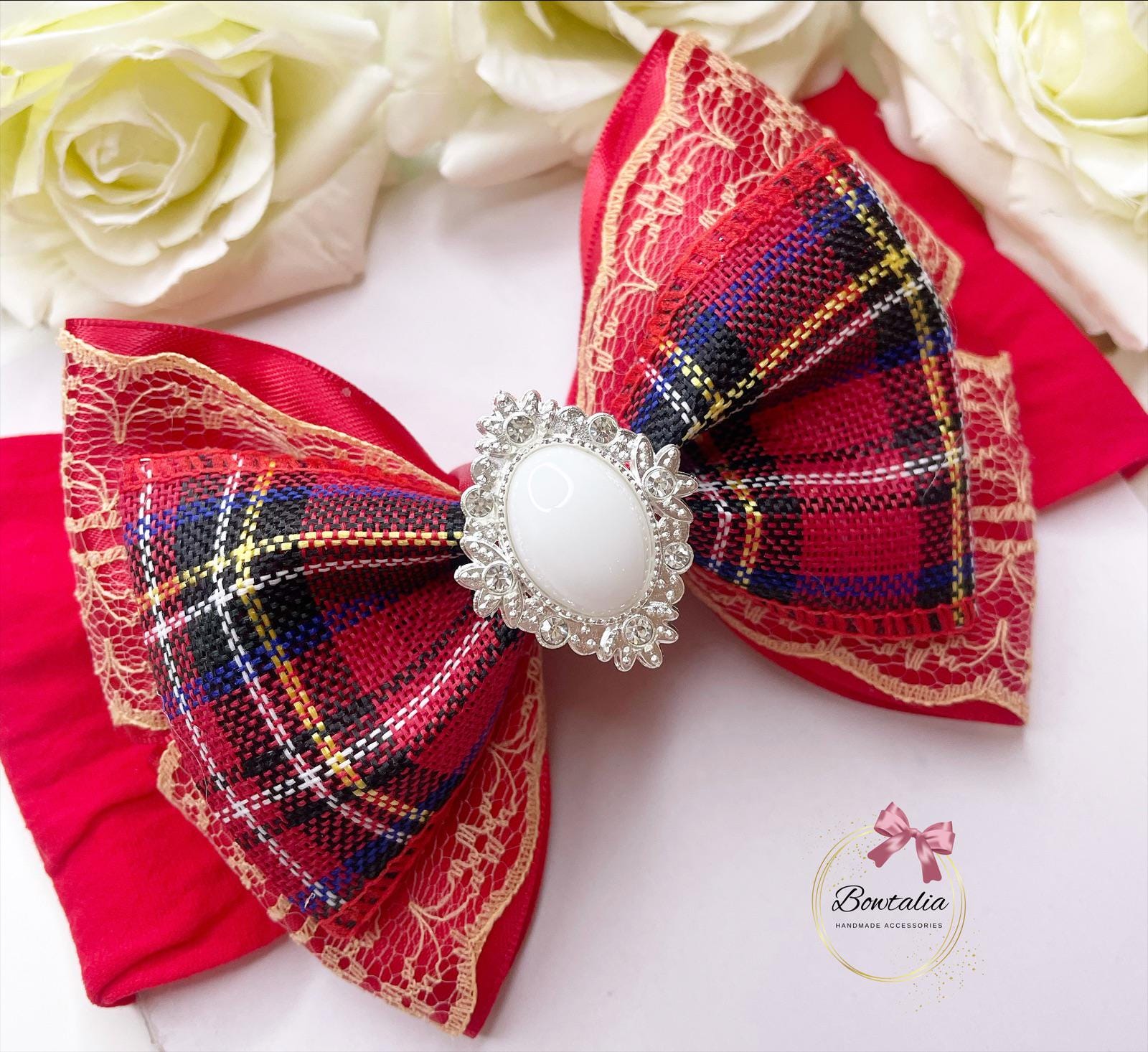 Lace and tartan bow with a white embellishment