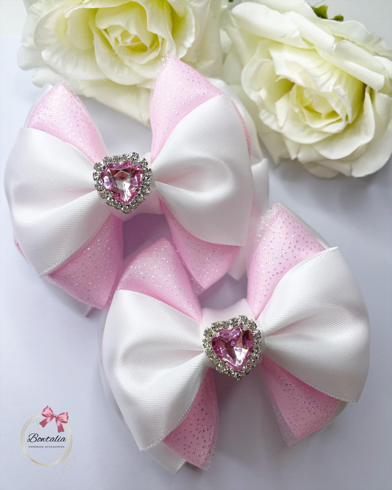 White and pink glitter layered bow clips with a pink heart centre.