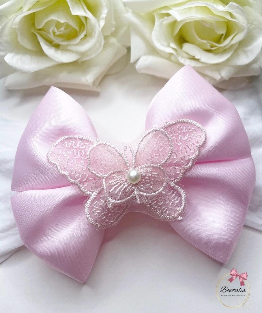 Light pink bow with a pink butterfly centre - attached to a thick white headband