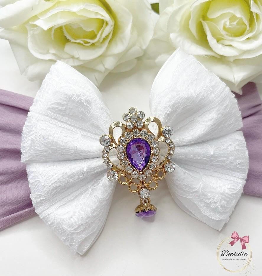Beautiful lace bow with a purple tear drop centre - attached to a thick plum headband