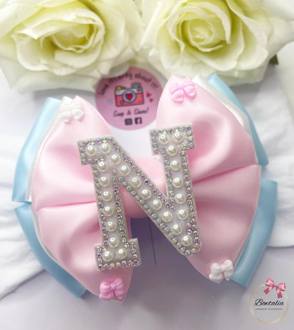 Pearl initial bow with bow details. Perfect to complete your little girls outfit.