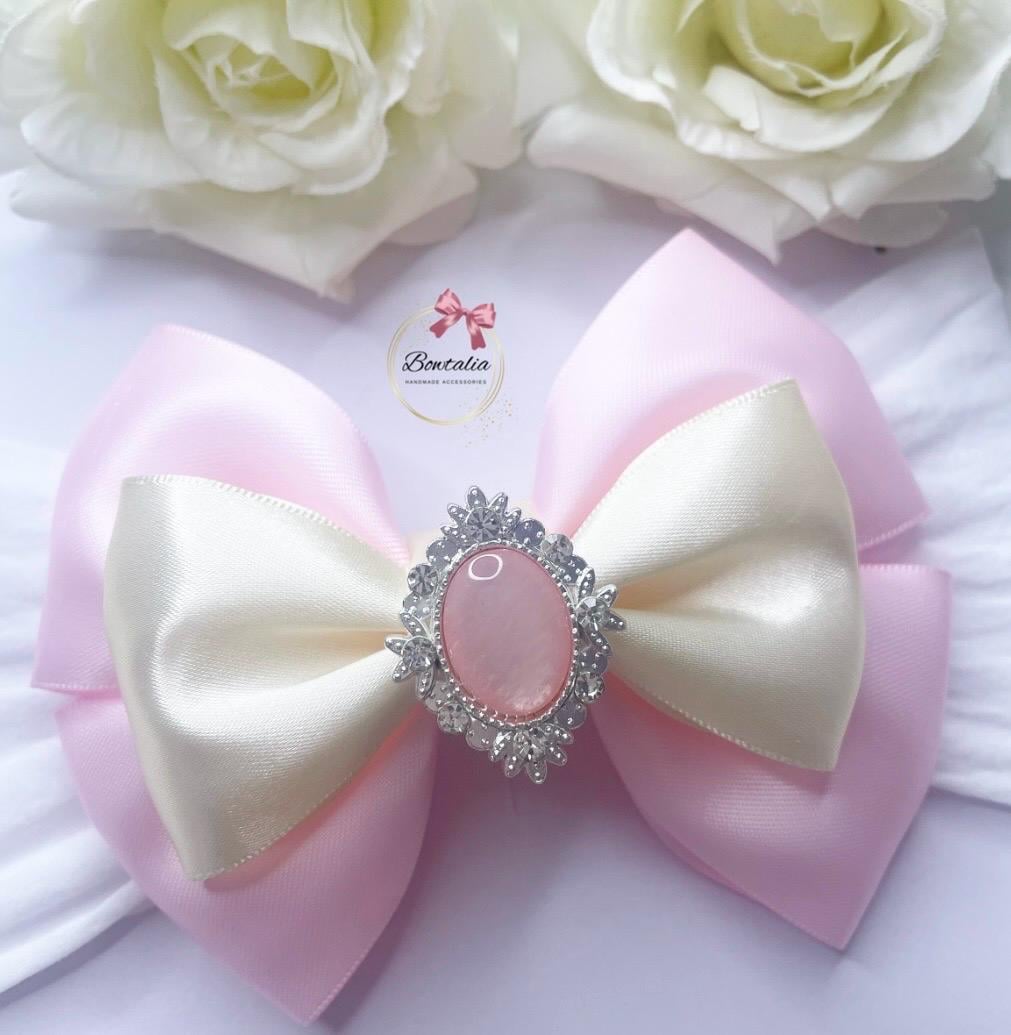 Handmade pink and cream bow with a pearl pink embellishment. The perfect accessory to finish your little ones outfit.