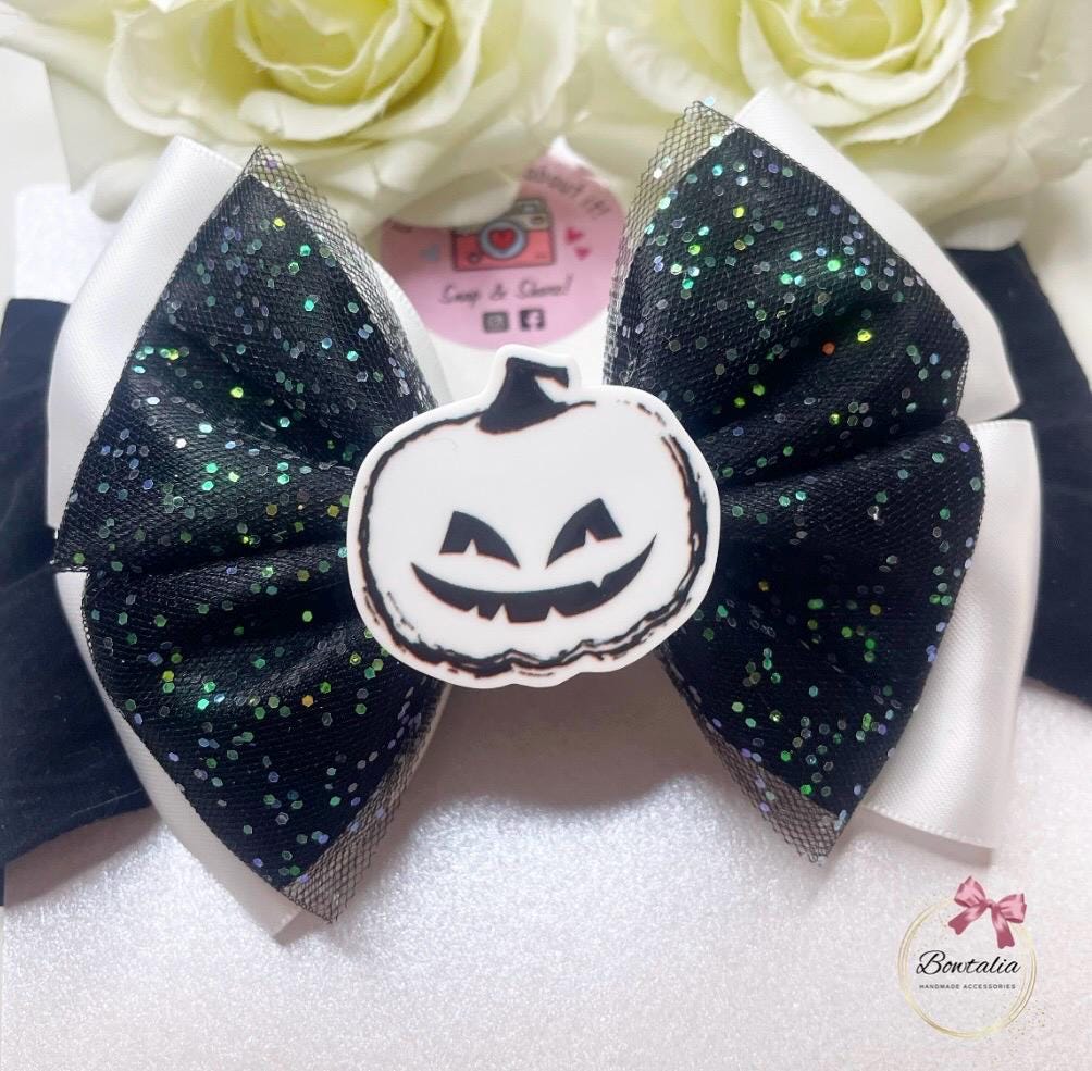Black and and white pumpkin halloween bow with a pumpkin centre