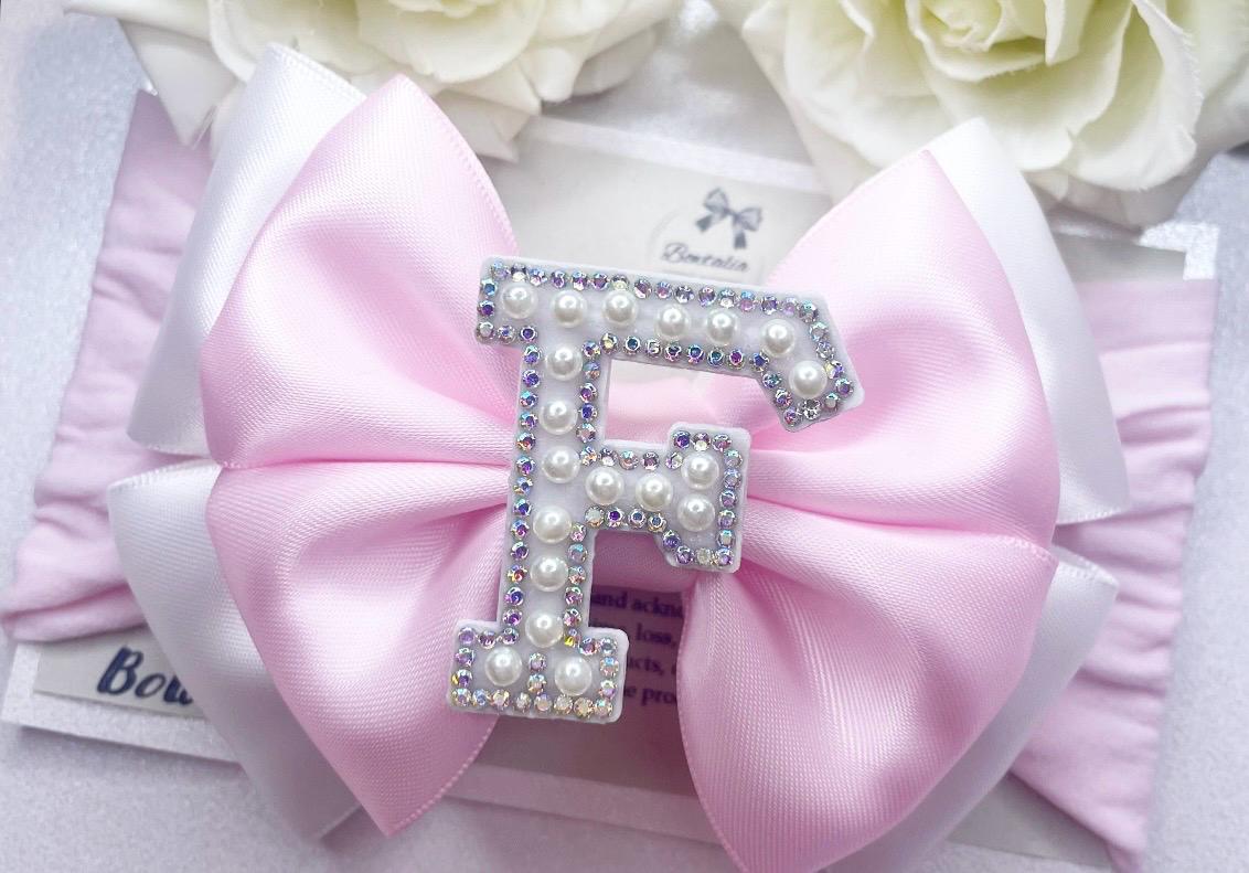 White and pink pearl initial bow
