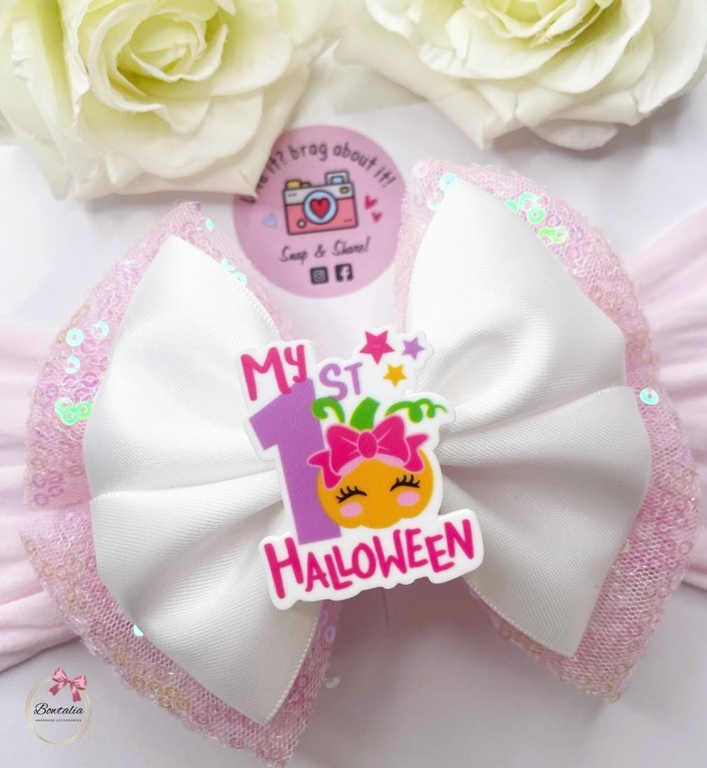 Pink and white my first Halloween bow - attached to a thick light pink headband.