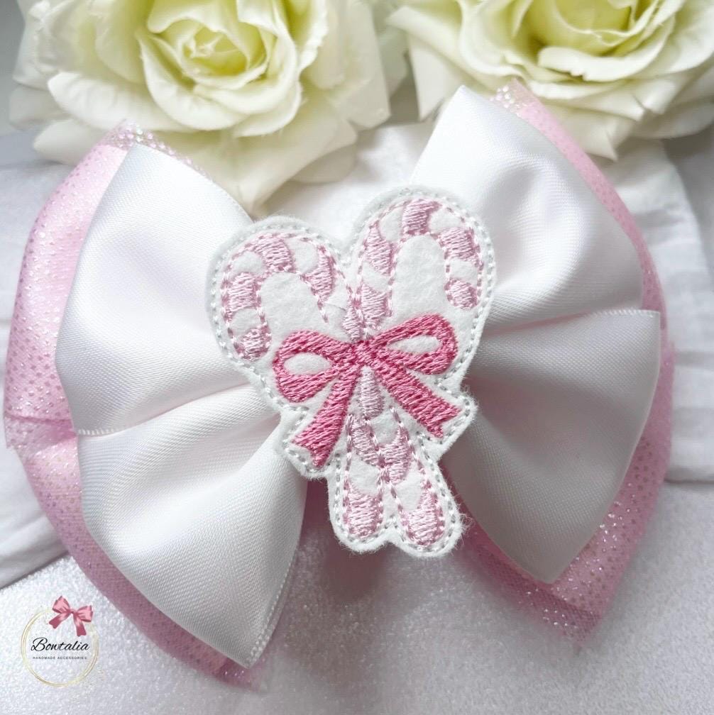 Pink and white candy cane Christmas bow - attached to a thick white headband