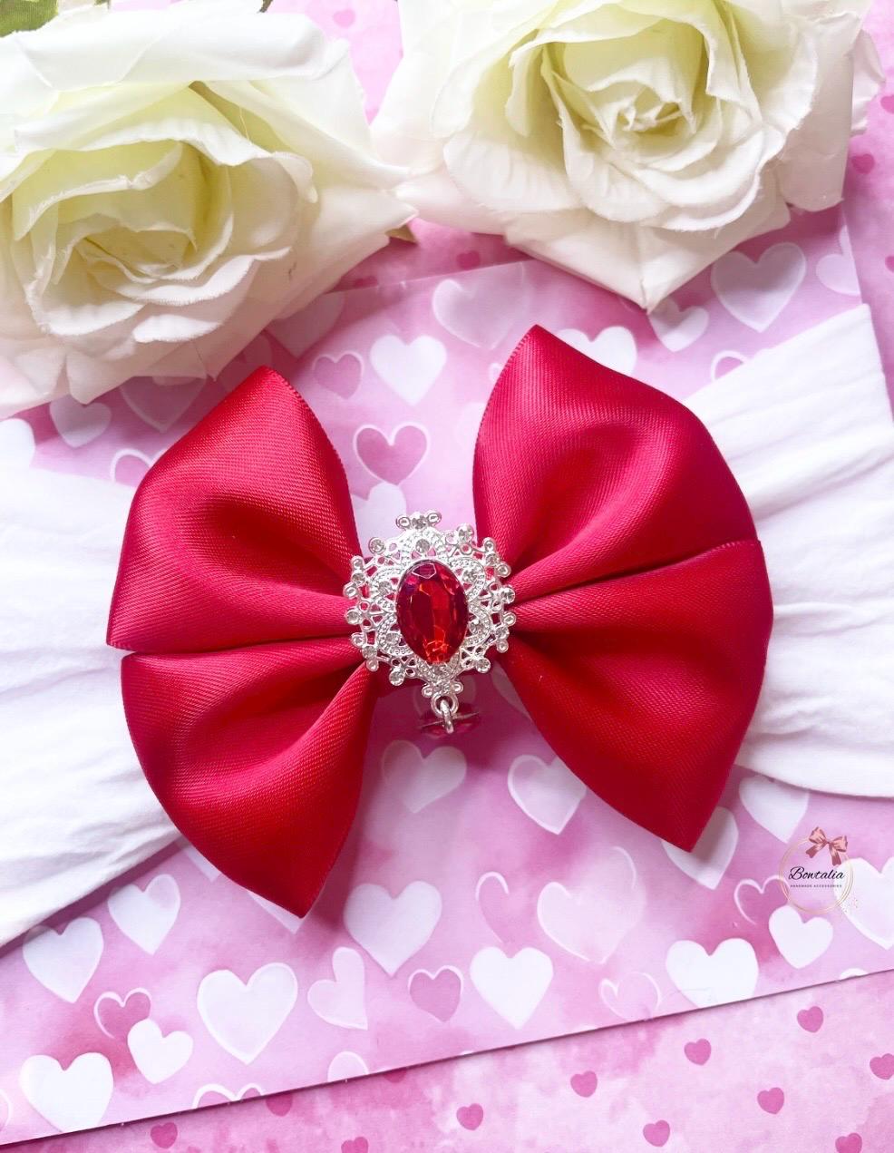 Red bow with a red tear drop embellishment attached to a thick white headband