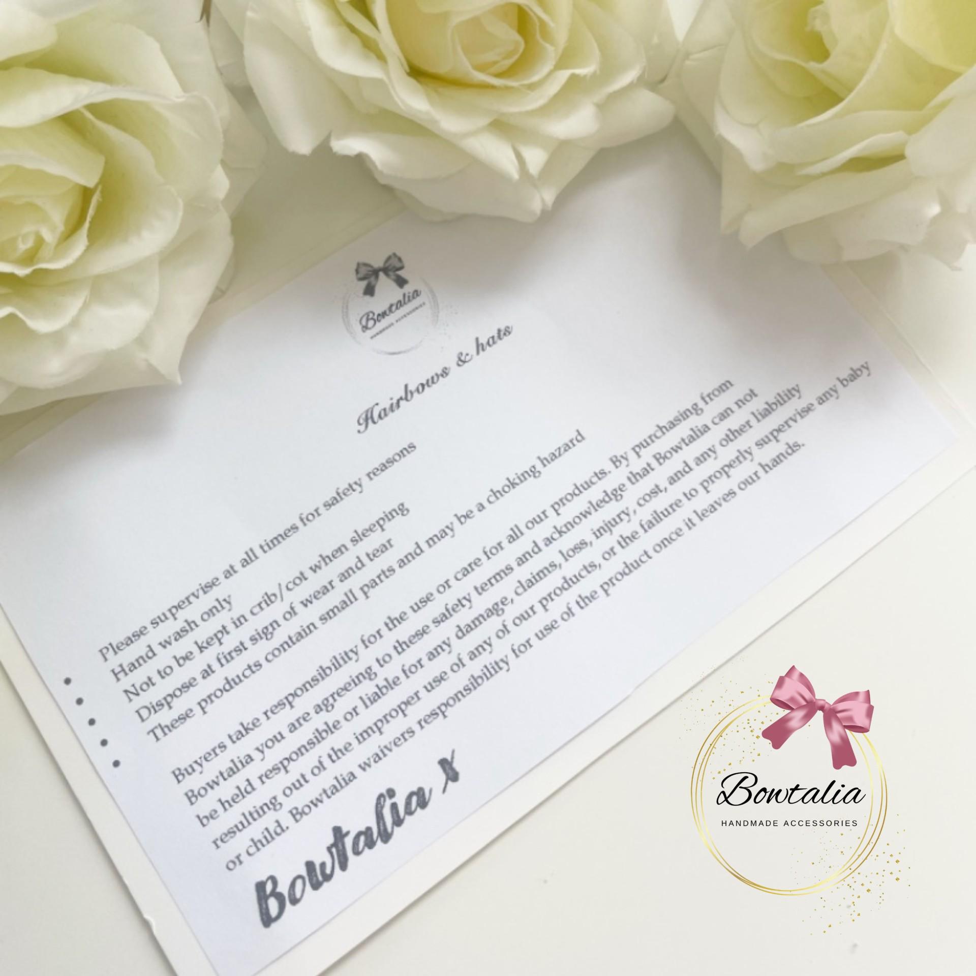 Buyers take responsibility for the use or care for all of our products. By purchasing from Bowtalia you are agreeing to these safety terms and acknowledge that Bowtalia can not be held responsible or liable for any damage, claims, loss, injury, cost and any other liability resulting out of the improper use of any of our products, or the failure to properly supervise any baby or child. Bowtalia waivers responsibility for use of the product once it leaves our hands.