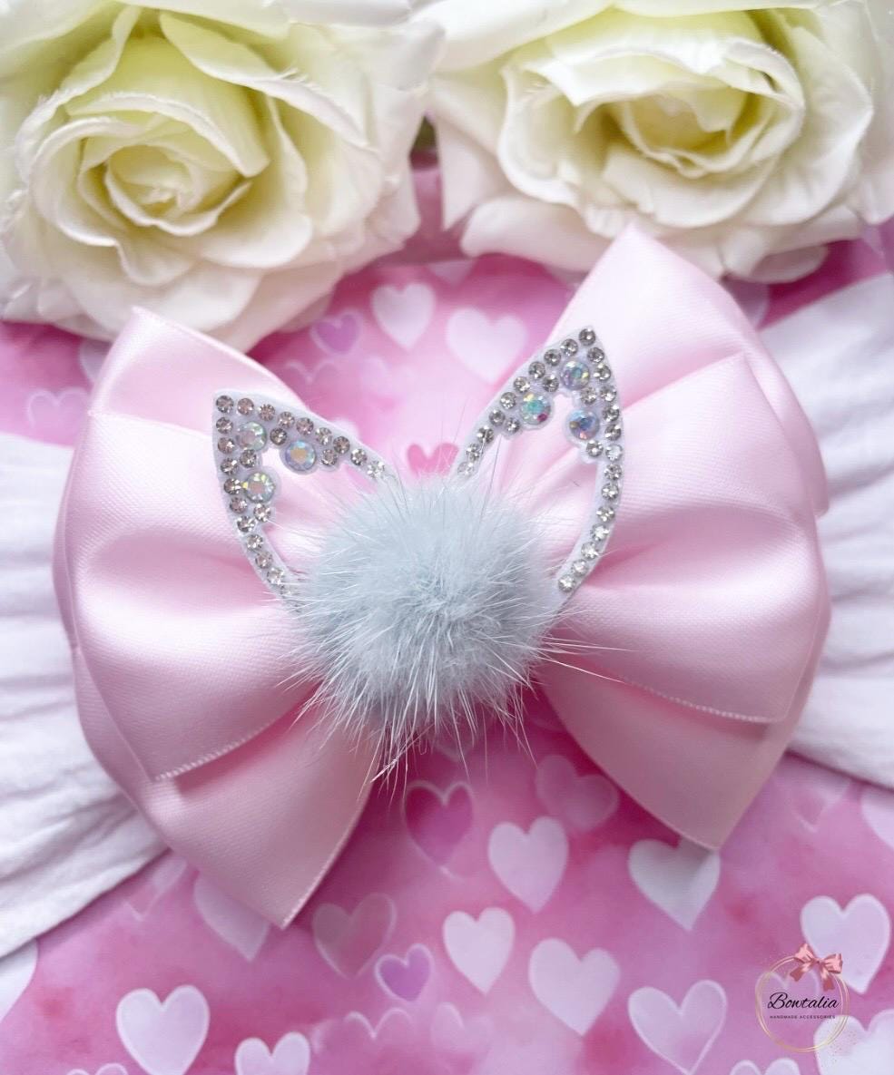 Easter pom pom bunny bow - attached to a white headband