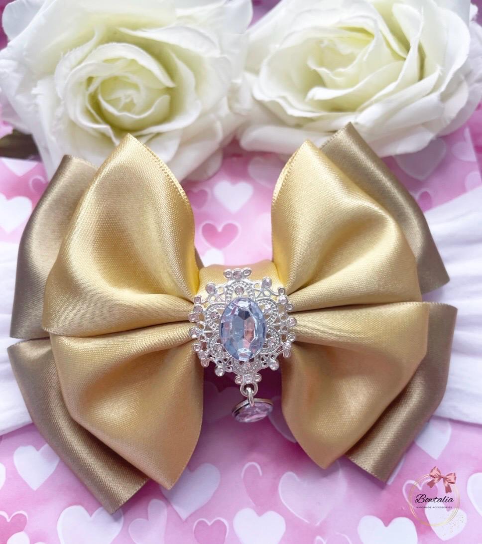 Double layer gold bow with a silver tear drop embellishment - attached to a thick white headband